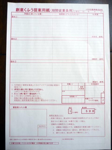 「創意くふう」は、トヨタ自動車独自のシステムで職場の改善に関する意見や提案を書くものなのですが、社員は月3件のノルマがあるため、社員を目指すのであれば月3件以上書いた方がいいです。